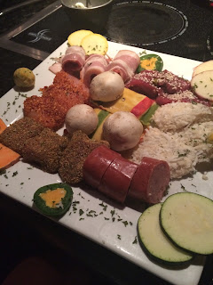 Next, the main meat course. We each got 3 choices of meat and received 3 pieces of each choice. We chose bacon wrapped sirloin, teriyaki sirloin, coconut crusted shrimp, herb crusted pork, garlic herb chicken, and beef sausage. It was served with 2 slices of yellow squash, zucchini, red potatoes, sweet potatoes, broccoli cheese bites, jalapeno cheddar bites, and cheese ravioli. We also got 4 mini portobello mushrooms for stuffing. It came with dipping sauces and batter if you wanted to batter fry the items.